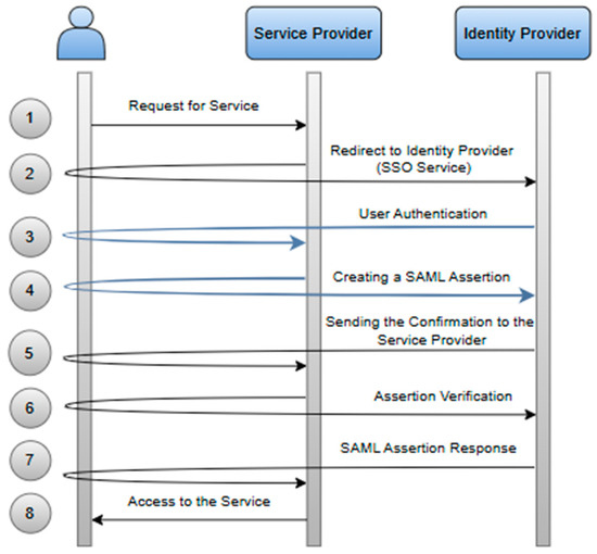 The main components of the SAML protocol, integrating various steps for user authentication [6].