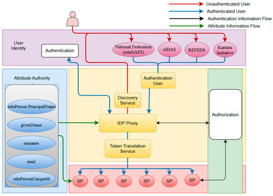 - Okabe, Y.; Komura, T.; Sato, H.; Yamaji, K.; Nakamura, M. An Authentication Federation Proxy Which Conceals Attributes and Authorization Policies Each Other. In Proceedings of the 2016 IEEE 40th Annual Computer Software and Applications Conference (COMPSAC), Atlanta, GA, USA, 10–14 June 2016; IEEE: Piscataway, NJ, USA, 2016; pp. 202–207. [Google Scholar] [CrossRef]