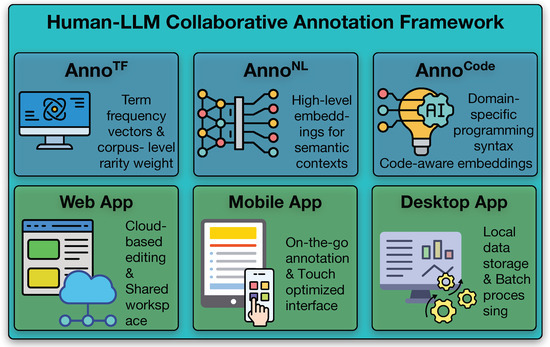 Overview of the human–LLM collaborative annotation framework. This diagram showcases three primary annotation engines, employing distinct approaches to evaluate the alignment between question titles and code snippets. AnnoTF leverages token frequency analysis with corpus-wide rarity adjustments, AnnoNL applies high-level semantic representations, and AnnoCode utilizes embeddings tailored for understanding code. The framework supports collaborative annotation across multiple platforms.
