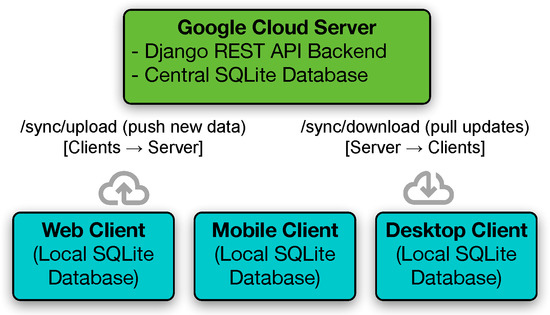 Figure 2 presents the multi-platform annotation architecture employed by SynCode, contextualized through the lens of the model–view–controller (MVC) architectural pattern. In this framework, the client applications, including desktop, mobile, and web-based interfaces, serve as the View layer, which is responsible for presenting the user interface and capturing annotation inputs. Each client operates with an independent local database, supporting responsive interaction and enabling offline annotation functionality. The controller is embodied by the system’s synchronization logic, which manages the coordination and transfer of data between the clients and the backend. When Internet connectivity is restored, this controller process synchronizes updates by transmitting locally modified data to the centralized backend. The model corresponds to the centralized repository hosted on Google Cloud and managed through the Django REST framework. It stores the canonical version of the annotation data, ensuring consistency, persistence, and integrity across all platforms. This clear separation of concerns promotes scalability, maintainability, and streamlined collaboration within the annotation ecosystem.