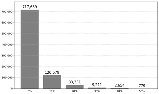 Stack overflow post counts across lexical relevance thresholds. This bar chart illustrates how the number of Stack Overflow posts varies according to different lexical relevance thresholds, as measured by a standard term weighting scheme. The x-axis represents increasing threshold levels (from 0% to 50%) used to determine the minimum required relevance between a post title and its corresponding code snippet. The y-axis shows the number of posts that meet or exceed each threshold. The steep decline in post counts, dropping from over 717,000 at 0% to fewer than 1000 at 50%, demonstrates the effectiveness of lexical relevance evaluation in filtering out low-quality or loosely related title–code pairs.