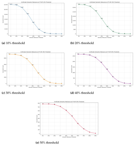 Expanding upon this initial relevance-checking framework, Figure 5 further illustrates SynCode’s comprehensive, integrated lexical-semantic annotation pipeline (AnnoTF and AnnoCode). Initially, Stack Overflow posts undergo systematic and rigorous lexical relevance assessment between titles and corresponding code snippets at various thresholds ranging incrementally from 10% to 50%. Each subfigure clearly delineates the progressively strict criteria applied to evaluating the title–code pairs, demonstrating the incremental narrowing of the dataset as increasingly rigorous thresholds are enforced. Following these initial lexical relevance checks, the remaining Stack Overflow posts undergo further semantic evaluations conducted by AnnoCode. This sophisticated transformer-based model systematically assigns semantic relevance scores, quantifying the degree of alignment between Stack Overflow question titles and the accompanying code snippets, based on deep, nuanced semantic contextual analysis.