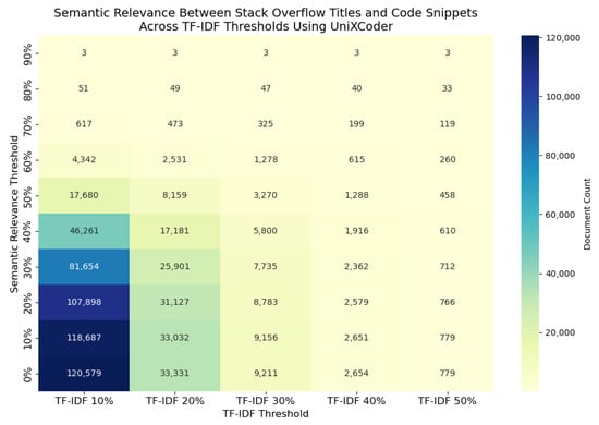 Heatmap visualization depicting the number of Stack Overflow posts retained at varying semantic relevance thresholds (0% to 90%, as measured by UniXcoder) and lexical relevance thresholds (TF-IDF, 10% to 50%). Darker cells indicate a higher document count, illustrating how combined lexical and semantic filtering progressively narrows the dataset to include only highly relevant title–code snippet pairs.
