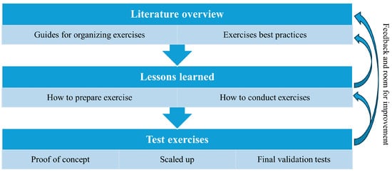 The exercise method was developed through an iterative process, shown in Figure 1, that combined a literature review, findings from past exercises, hands-on testing, and initial validation. The literature review focused on identifying key steps in exercise preparation and implementation. Sources included official manuals, public guides, and after-action reports from earlier cyber and wargaming exercises.