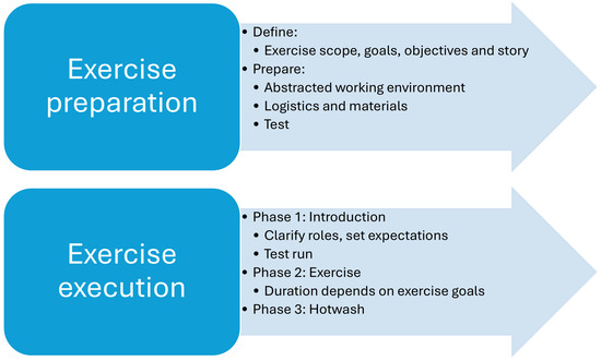 Our proposed exercise method structures the process into two primary phases: preparation and execution, as illustrated in Figure 2. As outlined in NIST SP 800-84 [7], preparation begins by defining the scope (e.g., involved organizational units) and exercise goals. The scope determines the level of abstraction; for instance, it may replicate the entire organization or focus on a simplified view tailored to senior management. Lower management levels generally require less abstraction, which must remain aligned with the exercise’s intended objectives. Similar to the NARUC guide [12], this process includes formulating a main exercise narrative, which serves as the foundation for subsequent planning.