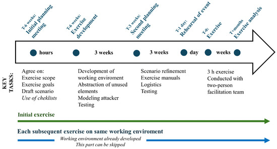 According to the literature reviewed during this research [5,6,7,8,9,10,12], exercise preparation often spans several months or even years. The execution phase, visible to participants and observers, typically lasts only a few hours or days and is thus the shortest phase of the process.