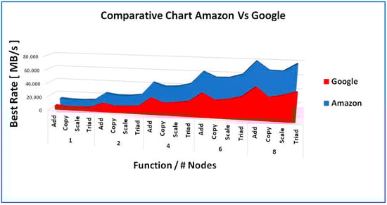 The execution of the Stream Benchmarks on both EC2 and GCP showed that both platforms are capable of scaling to increase the computational throughput. There is, however, a marked difference in the total throughput (MBps), indicating that AWS EC2 provided a higher throughput. A graphical representation of the best rate in MBps is shown in Figure 1. Overall, AWS outperforms GCP irrespective of the number of nodes and measuring function.