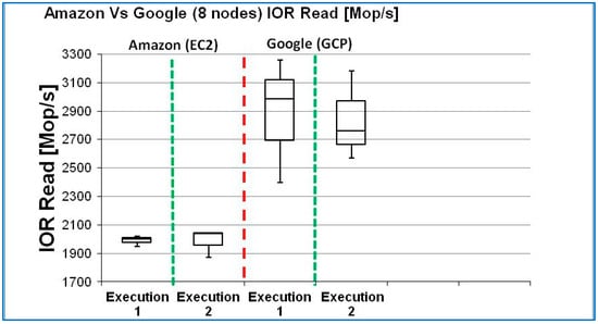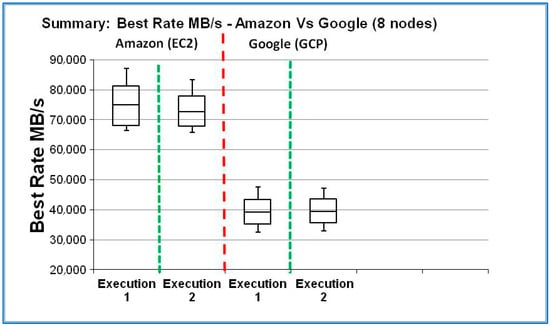 Figure 2 depicts the Inter-Quartile Range and Median as calculated with the data gathered during the statistical analysis. The box plots clearly show that both providers have a comparable behavior across both execution test sets. It is also visible that the MBps rate generated by AWS-EC2 is greater than that of GCP.