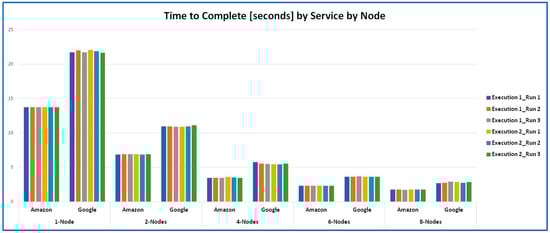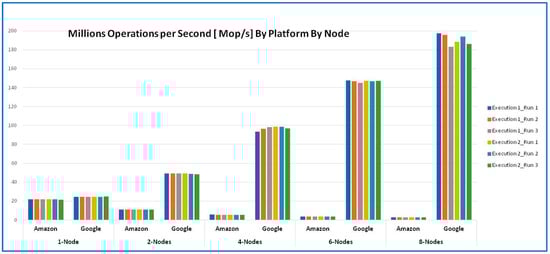 IaaS cloud platforms are generally multi-tenant, and user applications may be impacted by “noisy neighbors”. This occurs when one tenant’s excessive resource usage negatively impacts the performance or availability of other tenants using the same shared infrastructure. This can negatively impact other tenants in terms of slower performance and higher latency. The impact of the noisy neighbor tends to be random, and in order to capture some of this impact, the benchmarks were run over two random days at three different periods. It was ensured that the background processes within each VM used in the experiments were identical. Furthermore, to capture the performance of both a single node and a cluster of nodes in the cloud, the benchmarks were run using node counts of 1, 2, 4, 6, and 8.