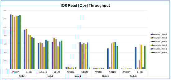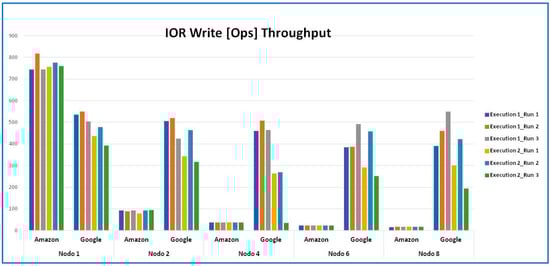 I/O performance is increasingly important for data-intensive computing. IOR measures parallel I/O performance in HPC environments. It is an MPI-based application that can generate I/O workloads in interleaved or random patterns. The benchmark measures input/output performance in MiB/s (1 MiB/s = 1 MB/s × 1.048) or read/write operations per second (Op/s). The IOR software is used for benchmarking parallel file systems using POSIX, MPIIO, or HDF5 interfaces []. I/O performance in MB/s is collected for both read and write operations, as well as the number of Op/s.
