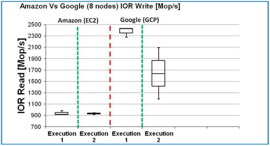 Like the findings in Figure 5 and Figure 6, the statistical analysis further supports the visuals. For both the read and write functions, it can be observed that the measured standard deviations for EC2 are quite similar and close to the mean, whereas the standard deviations for GCP are disparate. Table 8 lists the statistical analysis performed for the IOR benchmark.