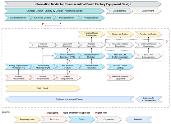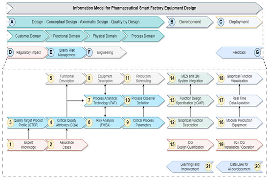 Pharmaceutical production typically focuses on individual drug types for each production line, which limits flexibility. However, the emergence of Industry 4.0 technologies presents new opportunities for more adaptable and customized manufacturing processes. Despite this promise, the development of innovative design techniques for pharmaceutical production equipment remains incomplete. Manufacturers encounter challenges due to rapid innovation cycles while adhering to stringent Good Manufacturing Practice (GMP) standards. Our research addresses this issue by introducing an information model that organizes the design, development, and testing of pharmaceutical manufacturing equipment. This model is based on an exploratory review of 176 articles concerning design principles in regulated industries and integrates concepts from Axiomatic Design, Quality by Design, Model-Based Systems Engineering, and the V-Model framework. Further refinement was achieved through insights from 10 industry experts. The resultant workflow-based information model can be implemented as software to enhance engineering and project management. This research offers a structured framework that enables pharmaceutical equipment manufacturers and users to collaboratively develop solutions in an iterative manner, effectively closing the gap between industry needs and systematic design methodologies.