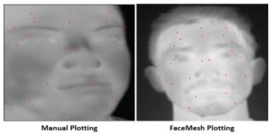 Two distinct methods were considered for feature extraction. The first method involves manual extraction by utilizing bounding boxes predicted by the facial recognition YOLO model. This is followed by resizing the image to 128 × 128 and manually locating the X and Y coordinates of facial landmarks from the resized thermal image. The second method utilizes FaceMesh version 0.4.1633559619, an advanced facial landmark detection model within the MediaPipe framework, which can precisely and directly identify 468 3D facial landmarks without the need for preprocessing like resizing or manual coordinate plotting. More recent deep learning architectures, such as transformer-based or hybrid architectures, while potentially offering higher accuracy, often demand significantly more computational resources, which may limit their applicability in practical, real-time deployment scenarios. The application of FaceMesh has proven to be more effective, particularly in accurately locating facial landmarks in grayscale images. Unlike many other approaches that are only suitable for RGB images, FaceMesh is more reliable in accurately locating facial landmarks from grayscale images, as shown in our study.