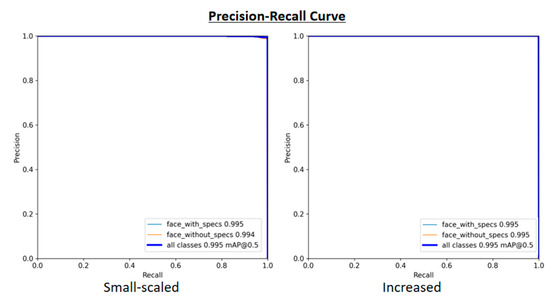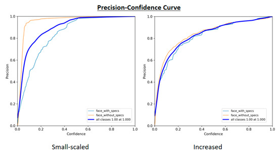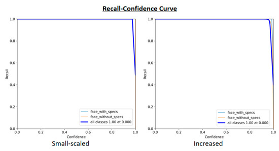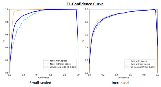 The performance of the YOLO model using the self-collected images (small scale, after this referred to as D1) was compared to the enhanced datasets where the training data included augmented data and selected images from the Tufts Face dataset (hereafter referred to as D2). Using D2, the model accuracy increased to 99.11%, which reflects the influence of the size of the dataset on the overall performance of the YOLO model. Using D1, the model was able to determine positive samples with high precision (1.00), as shown in Figure 4. Nonetheless, the precision might come at a trade-off with recall, as seen in the recall–confidence curve, showing a decrease with higher confidence thresholds. In contrast, the higher number of images in D2 maintains a high F1 score without sacrificing the overall performance. Refer Figure 5.