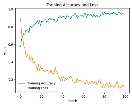 In terms of accuracy, SVM achieved 75%, which is the lowest compared to other models. Besides that, MLP has the lowest number of false positives, which is indicated by its high precision values, i.e., 86% sober and 93% drunk. True positive cases indicate a balanced sensitivity of MLP in drunk detection. Comparatively, the KNN model demonstrates competitive performance with precision, recall, and F1-score values ranging from 0.80 to 0.93. Compared to other models, MLP achieved the highest accuracy, i.e., 90%. This suggests that the MLP model excels in distinguishing between sober and drunk states, outperforming the other models in terms of overall correctness. When MLP predicts that a person is sober or drunk, the prediction is reliable. Figure 8 illustrates the training accuracy and loss across epochs.