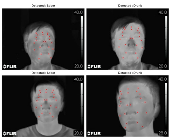 Figure 9 shows the successful outcome of the drunk detection process applied to a testing image for both sober and drunk conditions. Facial landmark identification is facilitated by the FaceMesh model from the MediaPipe library. The localization of facial landmarks based on 22 grid points is sufficient for the MLP to classify the thermal image accurately.