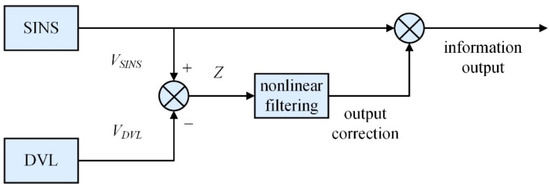The initial alignment of a SINS on a moving base can be achieved using the velocity information provided by a Doppler velocity log (DVL) [16]. Under conditions of large heading misalignment angles, the nonlinear characteristics of the error model pose challenges for traditional linear filtering methods, making it difficult to address the problem effectively. Therefore, a nonlinear filtering algorithm is employed in the initial alignment process to enhance both the accuracy and convergence speed of the filtering system. The working principle of this approach is illustrated in Figure 1.