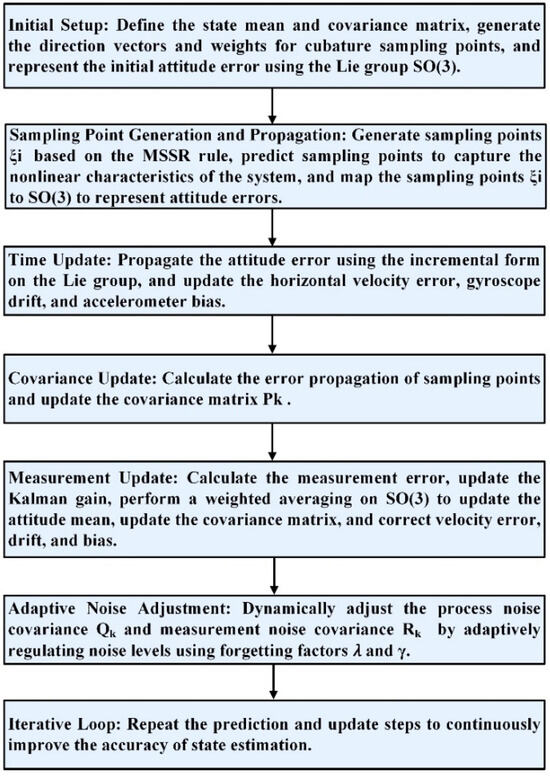 This paper presents an adaptive mixed-order spherical simplex-radial volume sampling-based constrained Kalman filter algorithm (MLG-AMSSRCKF) based on matrix Lie group representation. The algorithm represents the attitude errors as elements of the Lie group SO(3), thereby avoiding the linearization issue of rotational errors and enabling accurate state estimation within the Lie group manifold space. Meanwhile, velocity errors, as well as errors from gyroscopes and accelerometers, are still represented in the traditional Euclidean space. To improve the algorithm’s filtering accuracy, a mixed-order spherical simplex-radial volume sampling rule is utilized, which generates volume points on the Lie group manifold. By combining exponential and logarithmic mappings, the algorithm effectively handles attitude errors and optimizes the filter’s convergence speed and computational efficiency. Furthermore, through an adaptive noise adjustment mechanism, the algorithm achieves high precision and robustness in state estimation under complex dynamic environments. The specific steps of the algorithm are as follows.