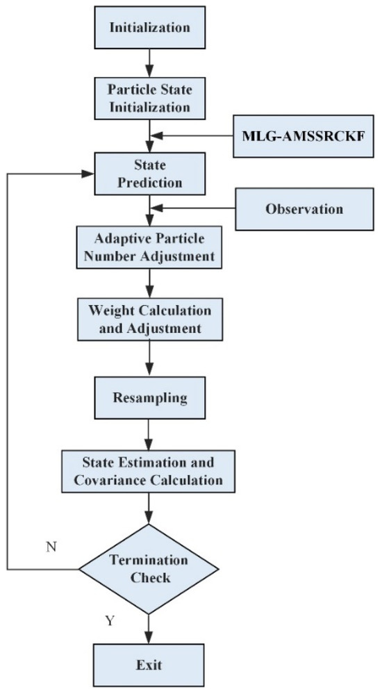 Section 4: Particle filter importance density function design and adaptive optimization strategy: This section presents an importance density function design method, based on the MLG-AMSSRCKF algorithm, which significantly enhances the particle distribution’s ability to adapt to non-Gaussian characteristics and higher-order statistical information. A dynamic particle number adjustment mechanism based on Euclidean distance is introduced to effectively reduce redundant particles and optimize the computational efficiency of the algorithm. Additionally, a multidimensional Huber loss function is employed to adaptively optimize particle weights, suppressing the interference of outliers and alleviating the severity of the particle degeneracy problem.