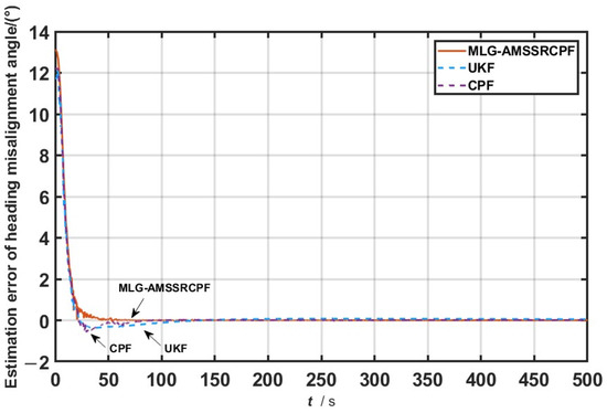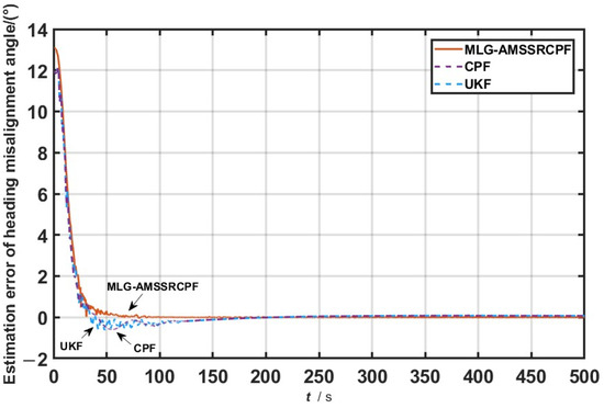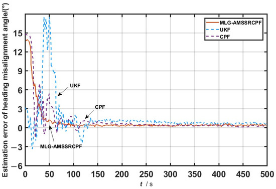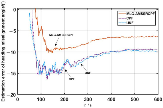 The alignment results based on UKF, CPF, and MLG-AMSSRCPF algorithms.