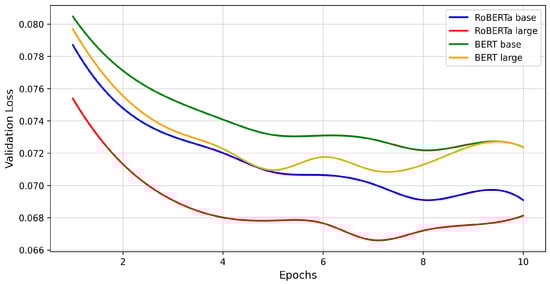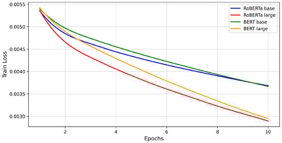 The average RMSE values across all of the models in this paper were similar, approximately 0.26, indicating comparable levels of prediction error. However, the RoBERTa models outperformed the BERT models in terms of , with the large RoBERTa model achieving the highest average value of 0.2404. Furthermore, the large RoBERTa model demonstrated a slightly better performance than that of its base counterpart, suggesting that the dataset’s size was sufficient to effectively leverage the increased capacity of the larger models. However, both the base and large BERT models exhibited a nearly identical performance, showing no improvement despite the increased model capacity.