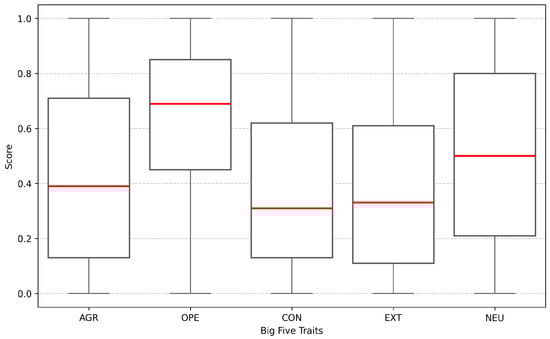 Various personality taxonomies have been developed to comprehend and assess personality—for example, the Big Five Model [5] and the Myers–Briggs Type Indicator (MBTI) [6]. The Big Five Model has emerged as one of the most widely utilised frameworks for personality evaluations due to its strong empirical backing and proven applicability across different cultures [7]. The Big Five Model consists of five key dimensions: Openness (OPE), Conscientiousness (CON), Extraversion (EXT), Agreeableness (AGR), and Neuroticism (NEU).