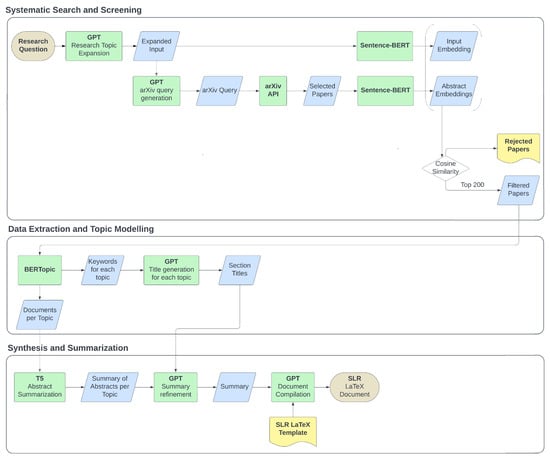 Our automated SLR pipeline architecture is organized into three interconnected phases: (1) systematic search and screening, which uses prompt-engineered GPT-4o and GPT-3.5 models along with TF–IDF filtering and named-entity recognition (spaCy) to identify and select relevant academic papers; (2) data extraction and topic modeling, which leverages Sentence-BERT embeddings for document clustering and BERTopic for unsupervised theme discovery; (3) synthesis and summarization, which employs hierarchical summarization via GPT-4o with chain-of-thought prompting and extractive–abstractive fusion to generate coherent summaries and integrate findings into a structured review document. Figure 1 presents the overall process.