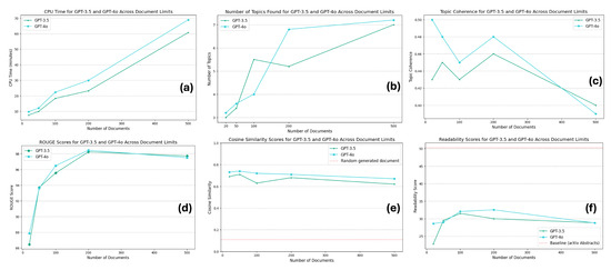 Performance metrics across different document limits for GPT-3.5 and GPT-4o in the SLR process. (a) CPU Time: GPT-4o consistently requires more time than GPT-3.5 as the number of documents increases, reflecting its computational complexity. (b) Number of Topics: GPT-4o identifies more topics, indicating a finer level of clustering. (c) Topic Coherence: Coherence is stable up to 200 documents for both models, but it declines as more documents are added, suggesting overfitting or noise. (d) ROUGE Scores: Summarization quality improves and plateaus around 200 documents. (e) Cosine Similarity: Both models show stable alignment with input queries, with diminishing returns beyond 200 documents. (f) Readability Scores: Readability peaks around 200 documents before declining, suggesting this as the optimal limit for accessible summaries.