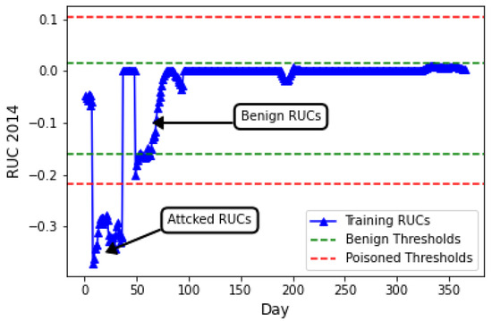 Generally, for most anomaly detection metrics (including ), higher and lead to greater deviations in the metric, indicating stronger poisoning impacts. However, when is excessively high, evident changes in the space may occur. Additionally, benign changes (refer to 50–100) highlight the necessity of threshold learning. Interestingly, the learned upper threshold also increases following a poisoning attack. This unexpected outcome arises due to the design of safe margins and , which aimed to reduce false alarms in the initial approach. Thus, robust learning for both thresholds is essential. Additionally, clustering-based methods to identify potential points are not unified, as the number of clusters formed a priori is unknown and depends on the specific values of and , with various combinations potentially used by an adversary. From the above analysis, we can infer that threshold learning is compromised in both directions. This finding is particularly noteworthy, as a single type of poisoning attack (i.e., deductive) during training can impact both the upper and lower thresholds, as illustrated in Figure 1. This manipulation enables the evasion of detection during testing.