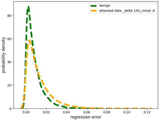 Small Strength Poisoning Attacks: Figure 2 depicts the two probability distributions originating from the two distinct sets (poisoned and non-poisoned) of regression errors. The yellow line in Figure 2 corresponds to the perturbed values arising from poisoned values represented by G. Specifically, the poisoning attack we implemented had a very small and we kept the . After performing a Kolmogorov–Smirnov test [17,18], we found that the contaminated distribution G most closely fits a double exponential distribution. However, note that the above is only true when is relatively small, given the same value of .