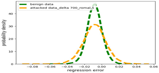 In contrast, the green line in Figure 2 represents the distribution of benign regression errors originating from the benign values, denoted as . The Kolmogorov–Smirnov test revealed that most closely fits the Gaussian distribution.