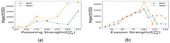 Figure 6a shows that the impact of NQC is either equal to or lower than the impact of QC for varying poisoning strength for a representative evasion attack with and . Similarly, Figure 6b shows either equal or lower impact of performance for NQC than the impact of QC for varying evasion attack for a representative poisoning attack with and . The results clearly indicate that the NQC loss function outperforms all other loss functions in terms of impact of undetected.