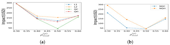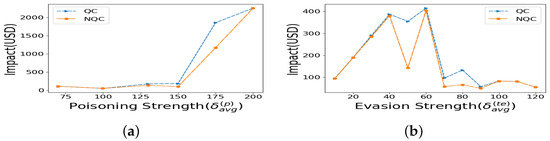 Impact versus Varying Attack Scale: We want to determine if the conclusions change when is adjusted. Figure 7a shows that the QC is either equal to or lower in impact than all other loss functions. Similarly, Figure 7b shows that the NQC is either equal to or lower in impact than NQH. For both Figure 7a,b, the poisoning attack strength is and the evasion strength is .