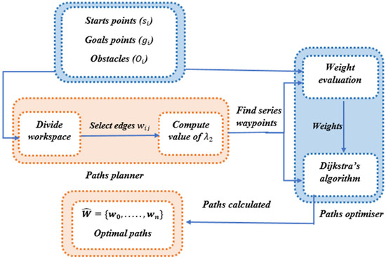 During a motion planning process, the algorithm selects paths for the robots that minimise their travel distance and ensures that each robot network’s algebraic connectivity is improved and maintained [24]. The optimisation process involves calculating the paths and connectivity at each step as outlined by the steps below.