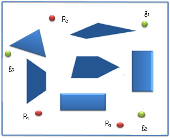 Scenario of a workspace: R1, R2, and R3 are robots (shown in red); g1, g2 and g3 are the corresponding goals (shown in green), and the polygons are the obstacles (shown in blue).