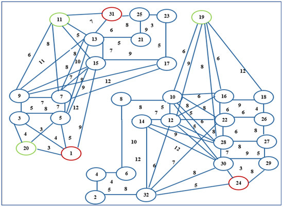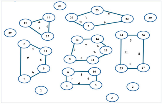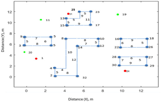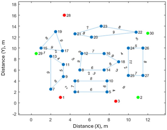 The workspace scenario depicted in Figure 2 is represented as an undirected weighted graph in Figure 3. In this figure, the vertices correspond to specific locations or points within the workspace, and the edges represent the possible paths connecting these points. The weights assigned to each edge indicate the cost or distance associated with traversing that path, facilitating the analysis and optimisation of movements within the workspace.
