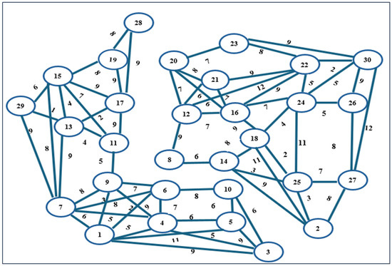 Workspace represented as a weighted graph. The weights of the edges indicate the distance associated with traversing the paths. Vertices 1, 3 and 28 are the positions of robots. The positions of the goals are 2, 29 and 30. The remaining vertices are vertices of obstacles.
