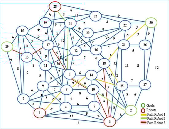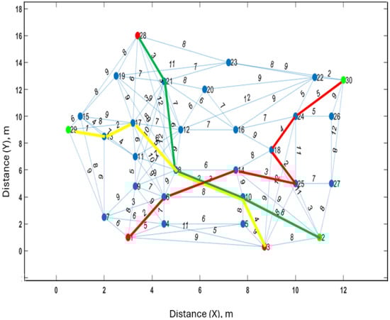 Paths planned by the MRPP algorithm (red for R1, green for R2, and yellow for R3). Path 1 for R1 = 1, 6, 14, 25, 18, 24, 30 (distance = 18 m), path 2 for R2 = 3, 10, 8, 17, 13, 29 (distance = 15 m), path 3 for R3 = 28, 21, 8, 10, 2 (distance = 20 m).