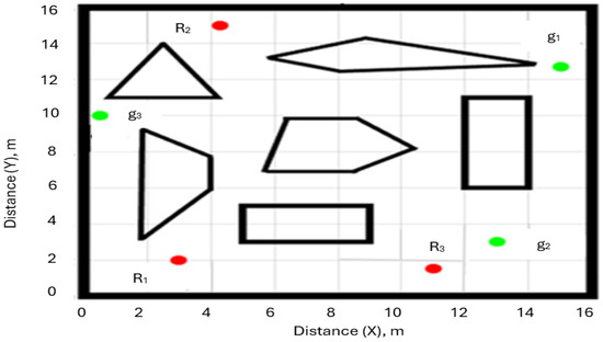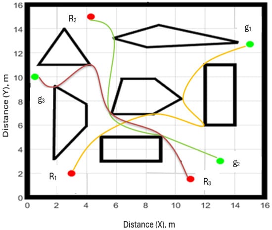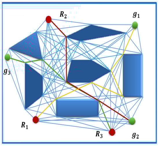 Parameters: three robots (R1, R2, R3) appearing as three red points were selected. Three goals (g1, g2, g3) were represented by green points. The six randomly generated polygonal obstacles () of varying sizes were highlighted in blue with different labels. Each robot was initialised at random start points and assigned unique goal positions. The algorithm’s effectiveness was evaluated in different scenarios with varying obstacles and numbers of robots. The performance metrics included path optimality and connectivity maintenance.