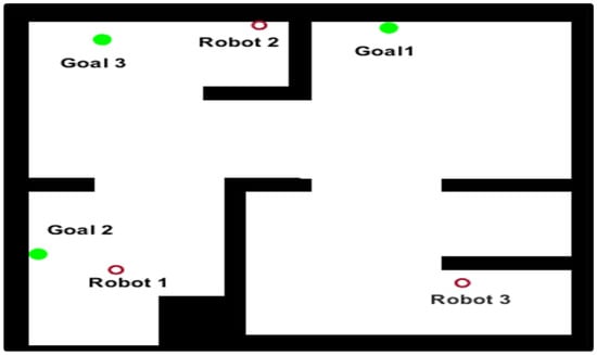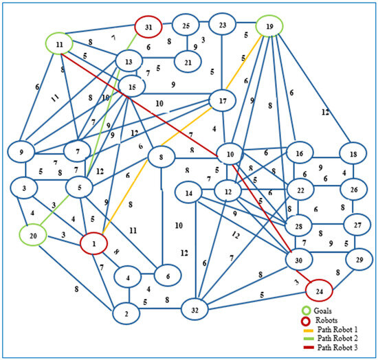 The MRPP algorithm planned the path for each robot based on a specific sequence or priority, i.e., the first path for , the second path for , and the third (last) path for . There was an intersection (crossroad) between the paths of and and opposite directions on the graph edges (straight roads) between the paths of and . However, no collision occurred as the algorithm planned a path for each robot sequentially (one by one). Hence, when planning the following path, it considers all the paths that have already been scheduled to prevent collisions and keep . There was a crossroad when passed the edge and passed the edge , but no collision occurred as passed before . The arrival time of when passing the vertex ( was ; once passing the vertex (, it was ; whereas the arrival time of when passing the vertex ( was ; when passing the vertex ( Consequently, that the arrival time of to the vertex was shorter than the arrival time of to the vertex because the distance (edge weight) that travelled to pass the vertex was less than the distance (edge weight) that travelled to pass the vertex ; thus, when arrived at the vertex , arrived at the vertex ; for this reason, no collision occurred, and a change of the edge weight was not necessary. If , then a collision would be possible (i.e., if the arrival time of on the vertex , then the change of the edge weight is necessary to avoid a collision). In addition, there were opposite directions (straight paths) on the edge between and . passed the edge earlier than the , where and . Thus, the arrival time of once it passed the edge was shorter than the arrival time of as the distance that had passed to arrive at the vertex was less than the distance that travelled to pass the vertex . Thus, . In addition, there was a crossroad on the vertex , where , and ; hence, , i.e., the arrival time of to the vertex was before . Accordingly, there was no need to change the edge weight since no collision occurred. If , then the collision happens, so the change of the edge weight is necessary to avoid a collision.