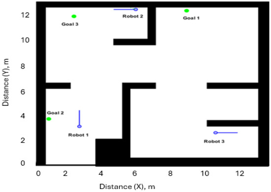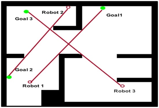 In this scenario, there are three robots and three goals. The workspace is divided into two disconnected components of an undirected weighted graph using a VG, such as in Figure 4.