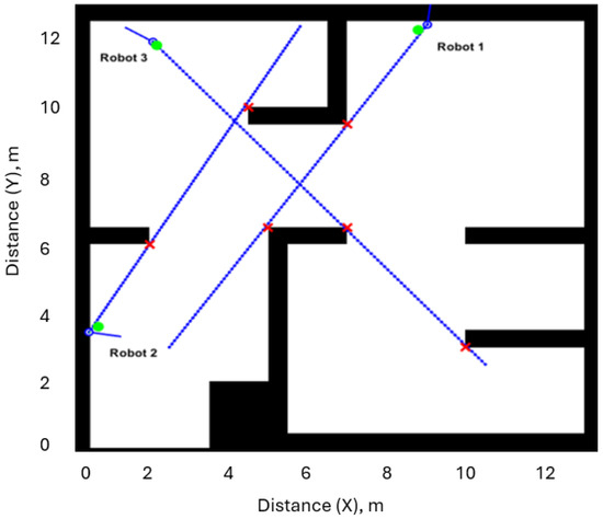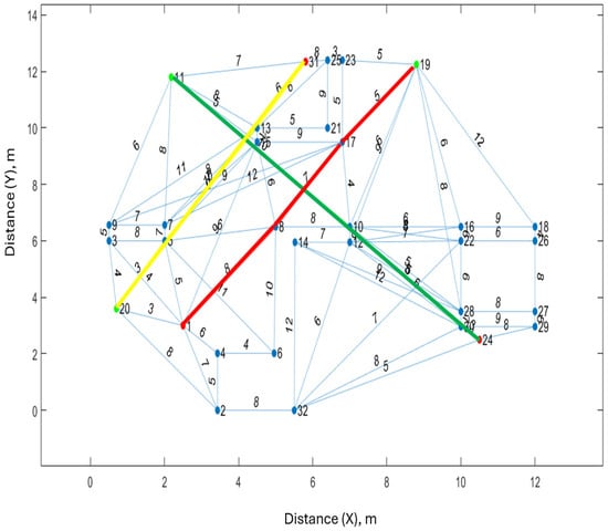 As shown in Table 2, the MRPP algorithm recalculated the paths for optimisation, examined the best edges to add, and chose vertices , with an increase of λ2 to 0.087. This created a robust link between the components because vertices had more connections in their respective components, enabling to find a path to reach its target: , with a total distance of 18 m. Then, it chose to add edges between vertices {(), ()} to find an optimal path for instead of the first path, while maintaining the communication graph at a high level. For , the new path was . With a total distance of 15 m, λ2 increased to 0.181. When the three edges were added together, { increased to 0.347. Then, found a path to reach its goal: with the total distance of 20 m. The MRPP algorithm chose the first path for R1, the second for R3, and the third (last) path for R2 (i.e., R1 → R3 → R2) based on a specific sequence or priority.