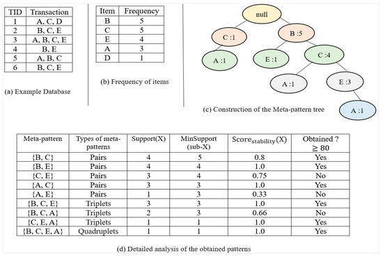 For instance, Figure 2a clearly shows that it is a transactional database involving six transactions of items {A, B, C, D, E}. This is used as the basis for pattern mining. Figure 2b demarcates the frequencies of individual items based on occurrence counts. The items are arranged in decreasing order based on their frequency. This ranking determines the item insertion order inside the meta-patterns tree to enable compression. In Figure 2c, we build a prefix-based meta-patterns tree to classify common item prefixes. The structure facilitates quick pattern generalization and meta-pattern mining. Item counts in each node represent the number of transactions sharing the same prefix path. Figure 2 provides a detailed analysis of the obtained patterns and their stability. It presents the different types of meta-patterns, classified into pairs (itemsets of size 2), triplets (size 3), and quadruplets (size 4), thus allowing for the observation of their evolution. For each meta-pattern, the table displays its support, which is related to the number of transactions in which it appears, and additionally, the minimum support of its sub-patterns, used to calculate the stability score. A meta-pattern is retained as stable and strong if its stability score is more than or equal to 80%. Conversely, it is deleted if its score falls below this level since it is considered too unstable or negligible for association rule extraction.