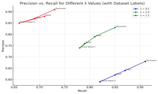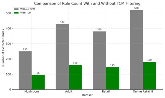 Contextualization in terms of the existing literature: Several earlier efforts have suggested only algorithmic enhancements or new measures aimed at enhancing association rule mining [,]. Yet, none of these efforts attempt the multi-level strategy incorporating structure, information, and logic, which DERAR accomplishes. Additionally, the concept of a dynamic threshold governed by a selectivity parameter λ has not been thoroughly analyzed in earlier academic literature, although there is awareness that adaptive methods are advantageous in a range of contexts [,]. The novelty of DERAR is essentially that it can integrate statistical features (MI), structural features (meta-patterns), and semantic features (TCM), thereby improving simultaneously the accuracy and robustness of the generated rules.