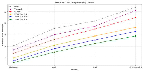 General interpretation of DERAR’s performance: A detailed comparison of the efficiency of the DERAR algorithm demonstrates that experimental results achieve notable enhancements in computational efficiency and logical consistency of extracted rules, as opposed to current techniques such as Apriori, FP-Growth, and H-Apriori. In terms of execution time, DERAR excels by effectively lowering the processing expenses, specifically for processing very large datasets (Retail, Online Retail II). This relies on multi-stage filtering at the high level: the initial discovery of meta-patterns, structuring through mutual information (MI) with dynamic thresholding, and ultimately selection through the Target Concentration Measure (TCM). This incremental architecture facilitates the removal of redundant or uninformative rules upstream, thus preventing the computational burden found in traditional methods.