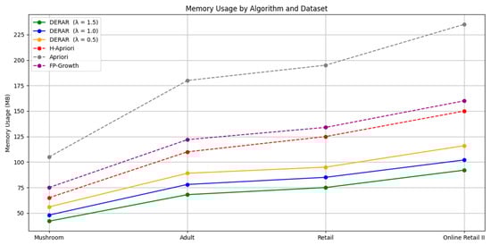 Memory consumption follows a similar trend: DERAR consistently requires less memory than Apriori, FP-Growth, and H-Apriori. This is evidence of the structural and semantic reductionism built into the algorithm not only saving time but also hardware resources, a precious commodity when dealing with online or distributed analysis situations.