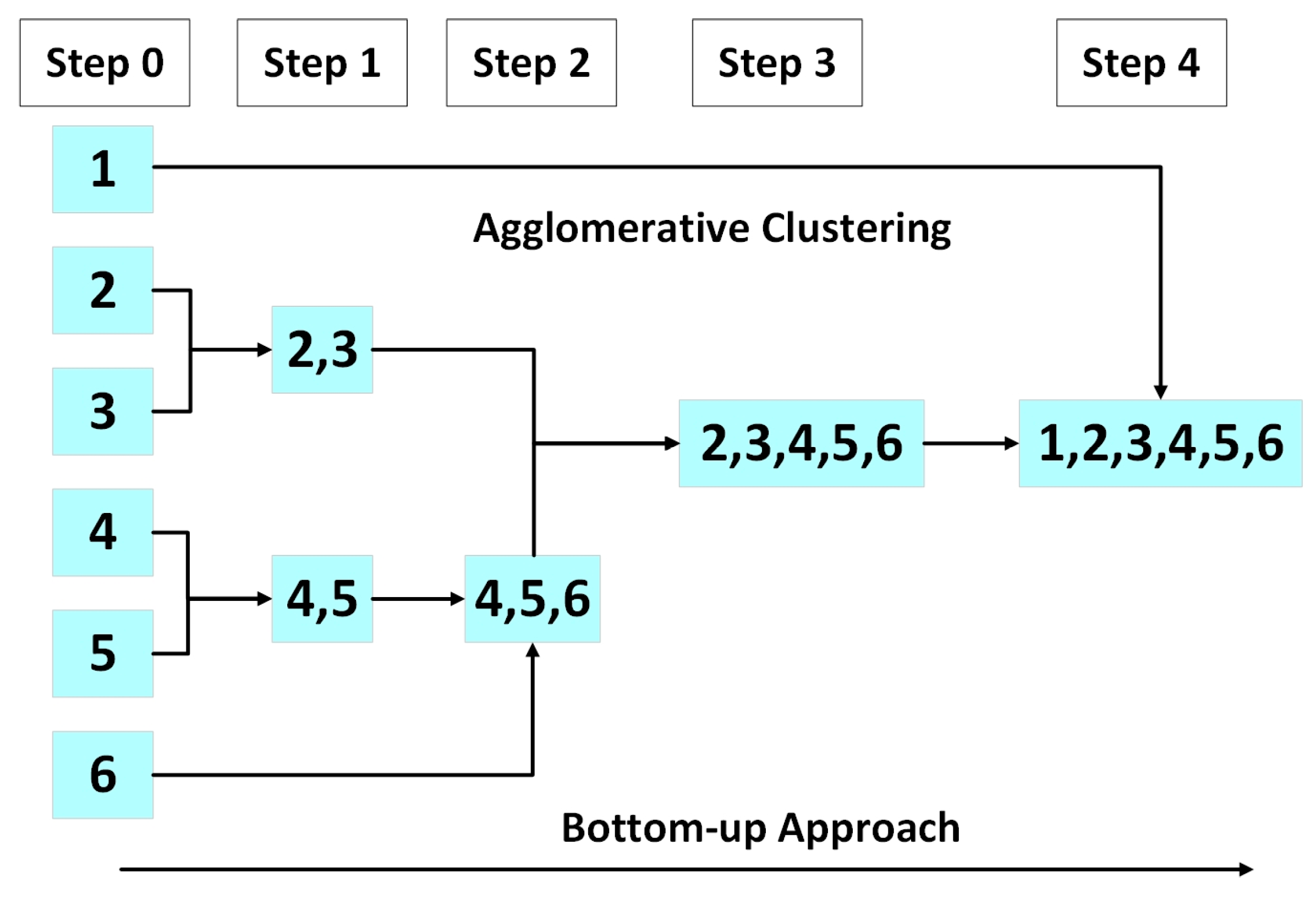 - Initialization: the algorithm begins with each data point as its own individual cluster:where xi represents each data point and n is the total number of data points;C = {{x1}, {x2}, …, {xn}}