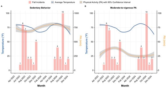 Observed time spent in physical activity (PA) (minutes), temperature (Fahrenheit), and fall incidents during the study period (April 2023–December 2024). (A) Sedentary behavior. (B) Moderate-to-vigorous PA.