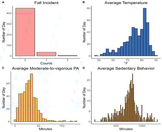 Histograms of (A) fall incident, (B) average moderate-to-vigorous PA time (minute), (C) average sedentary behavior time (minute), and (D) average outdoor temperature (°F). Colors were chosen for visual clarity and are used consistently throughout: pink = fall incident, dark blue = temperature, and orange = PA (MVPA, SB).
