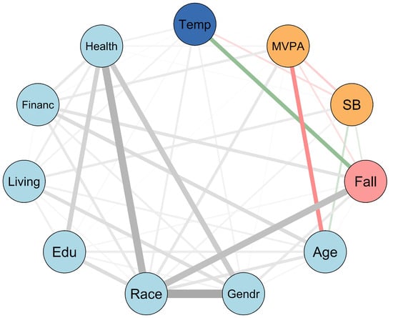 Mixed undirected graphical model estimated the associations among fall incident (Fall), average temperature (Temp), physical activity intensities (MVPA and SB), and sociodemographic factors (Age, Gendr, Race, Edu, Living, Financ, and Health) of 304 low-income older adults. Edges represent conditional dependencies and their thickness reflects the strength of the association: thicker edges indicate stronger associations. Edge color indicates direction: green for positive and red for negative. Gray edges represent relationships involving at least one categorical variable, whose sign cannot be determined. Node colors were chosen for visual clarity and are used consistently throughout to represent different variable categories: dark blue = temperature, orange = PA (MVPA, SB), pink = fall events, and light blue = sociodemographic factors.